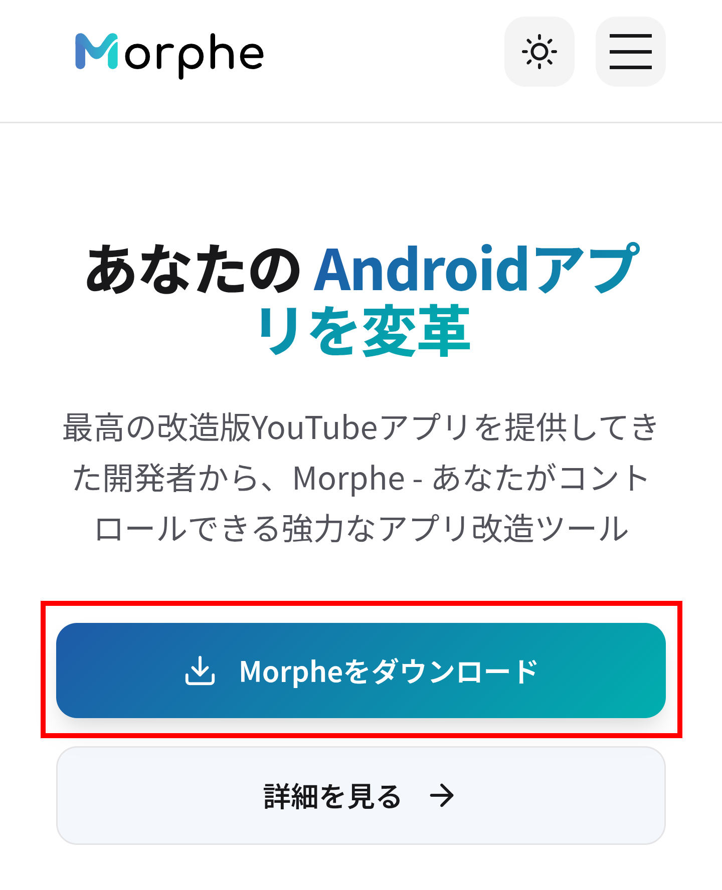 以下の公式サイトにアクセスし、「Morpheをダウンロード」をタップします。