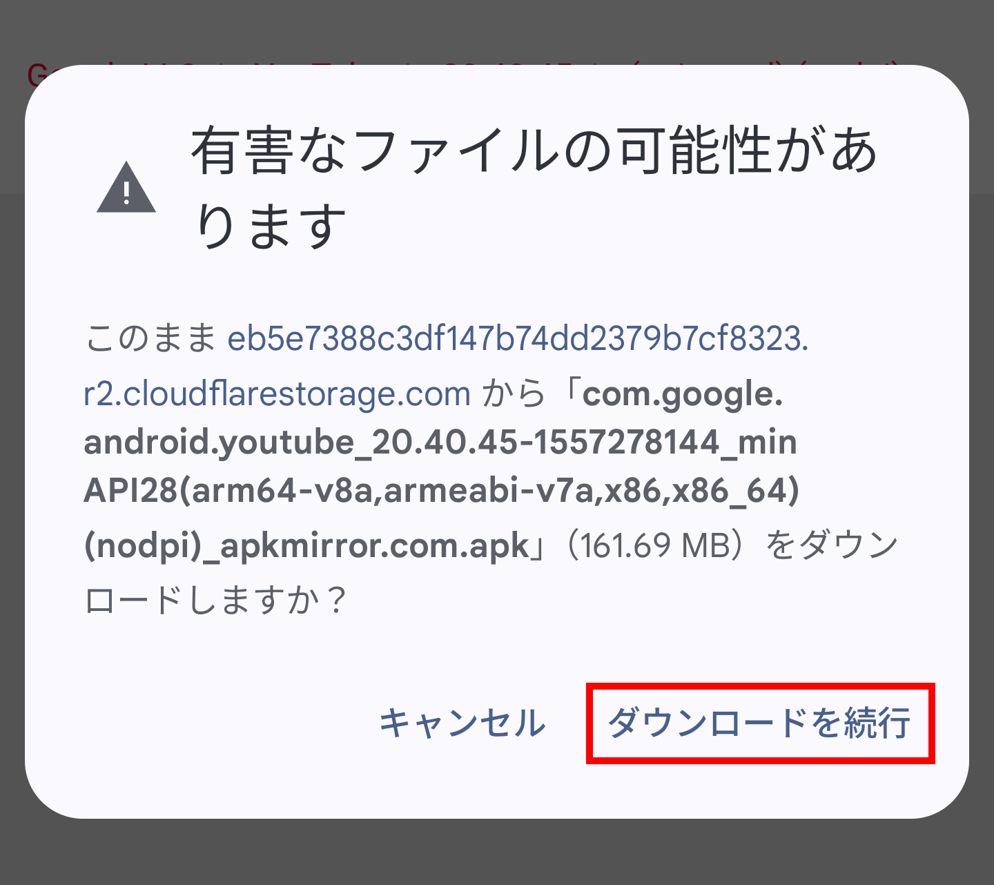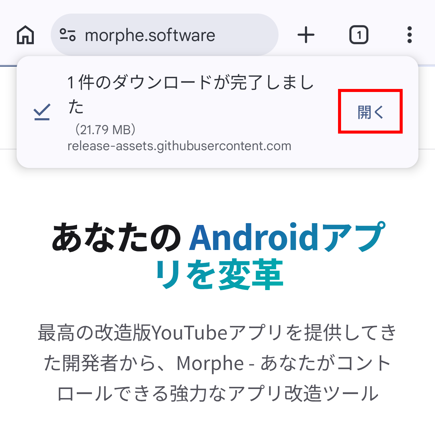 「ダウンロードを続行」をタップします。ダウンロードが完了したら「開く」はタップせず、Morpheに戻ってください。