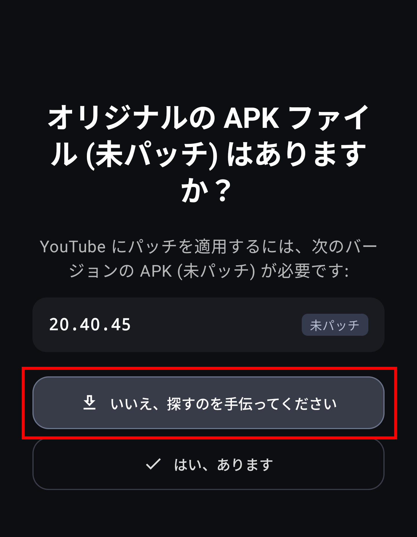 「次のバージョンのAPKが必要です」と書かれた部分を見て、必要なバージョンを確認します。以下の例だとバージョン20.44.38です。次に「保存済みAPKを使用する」と書かれた部分を見て、カッコ内のバージョンが必要なバージョンと同じ場合はここをタップします。それ以外の場合は「いいえ、探すのを手伝ってください」をタップしてAPKMirrorから該当バージョンをダウンロードしてください。その後、初期導入手順と同じように進めてアプリを更新してください。