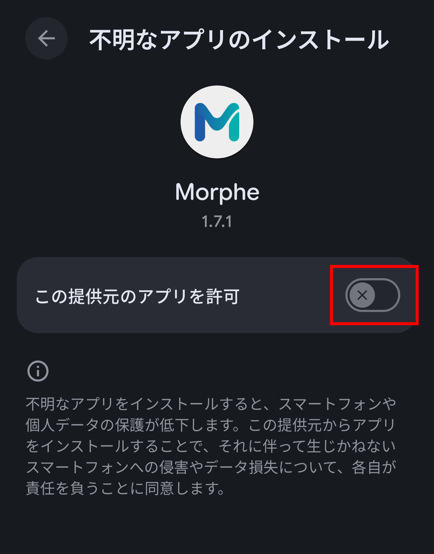 「この提供元のアプリを許可」のトグルスイッチをタップしてオンにします。