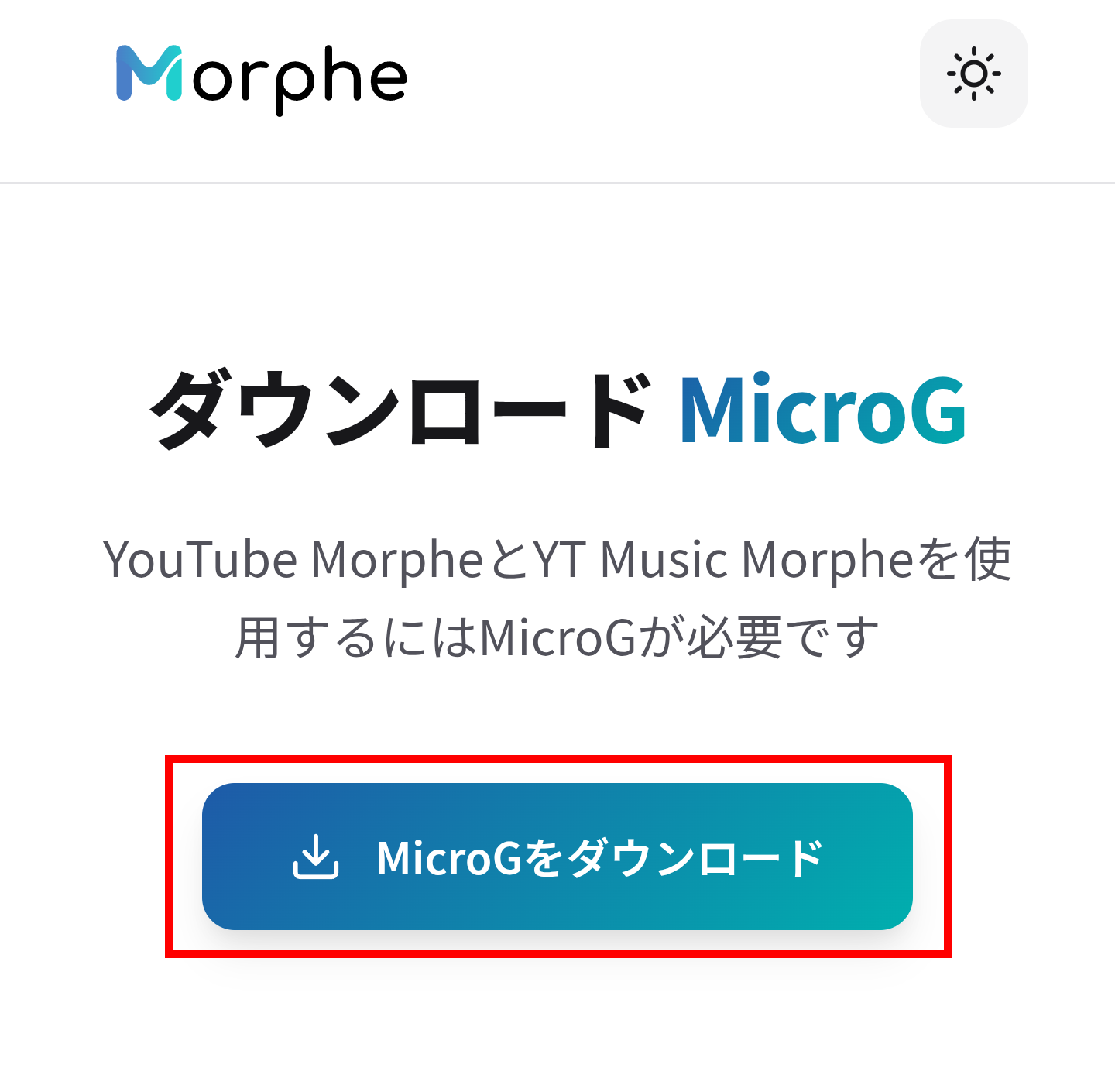 YouTube Morpheを正しく動作させるために必要なアプリ「MicroG」のページが開きます。「MicroGをダウンロード」をタップしてください。