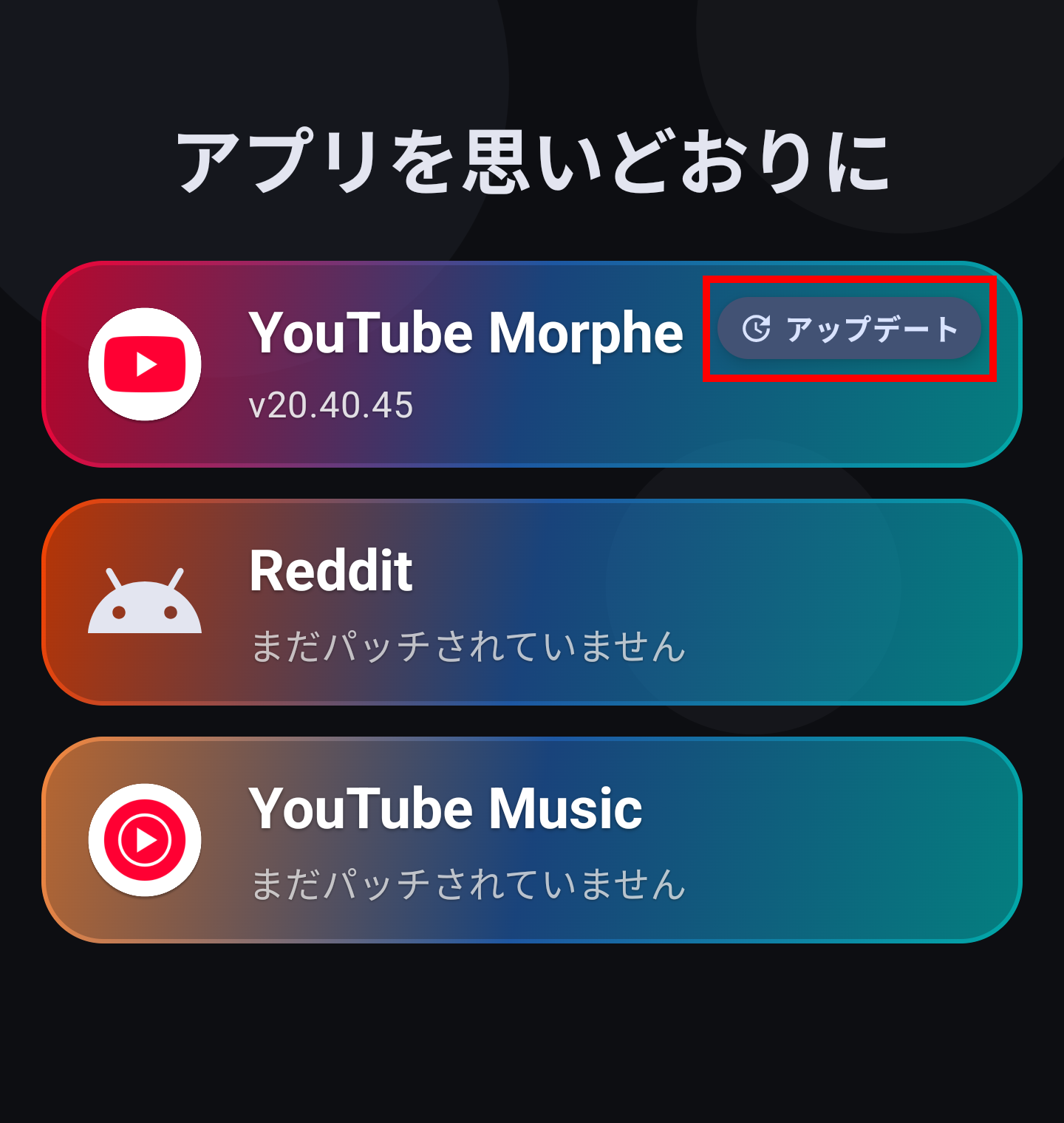 まずはMorpheを開き、「アップデート」という表示があるかどうかを確認してください。あればアップデートできます。「YouTube Morphe」をタップしてください。