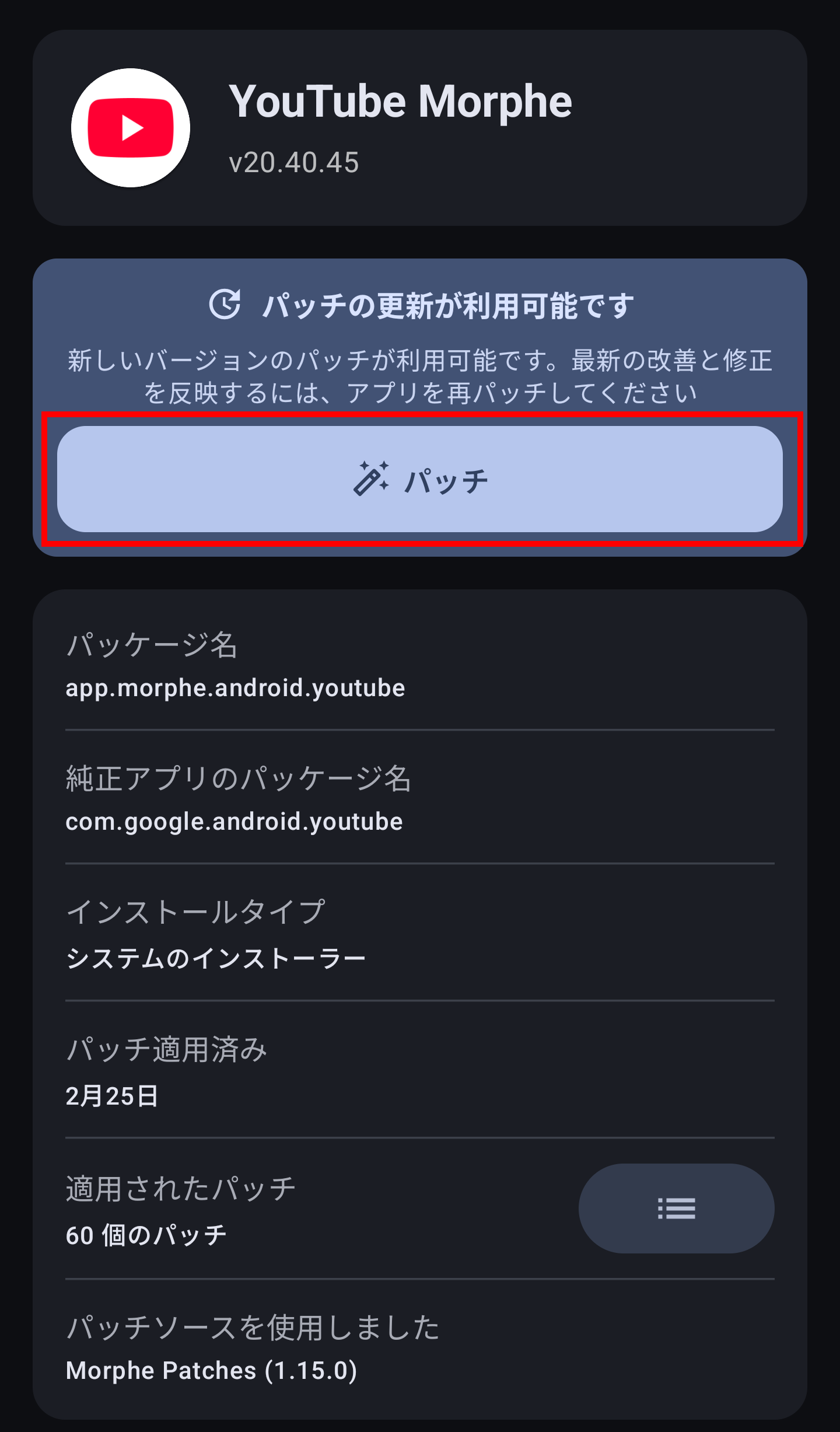パッチの適用画面でエラーが出る場合、Morphe Manager自体の更新が必要かもしれません。公式サイトから最新バージョンを入手してください。